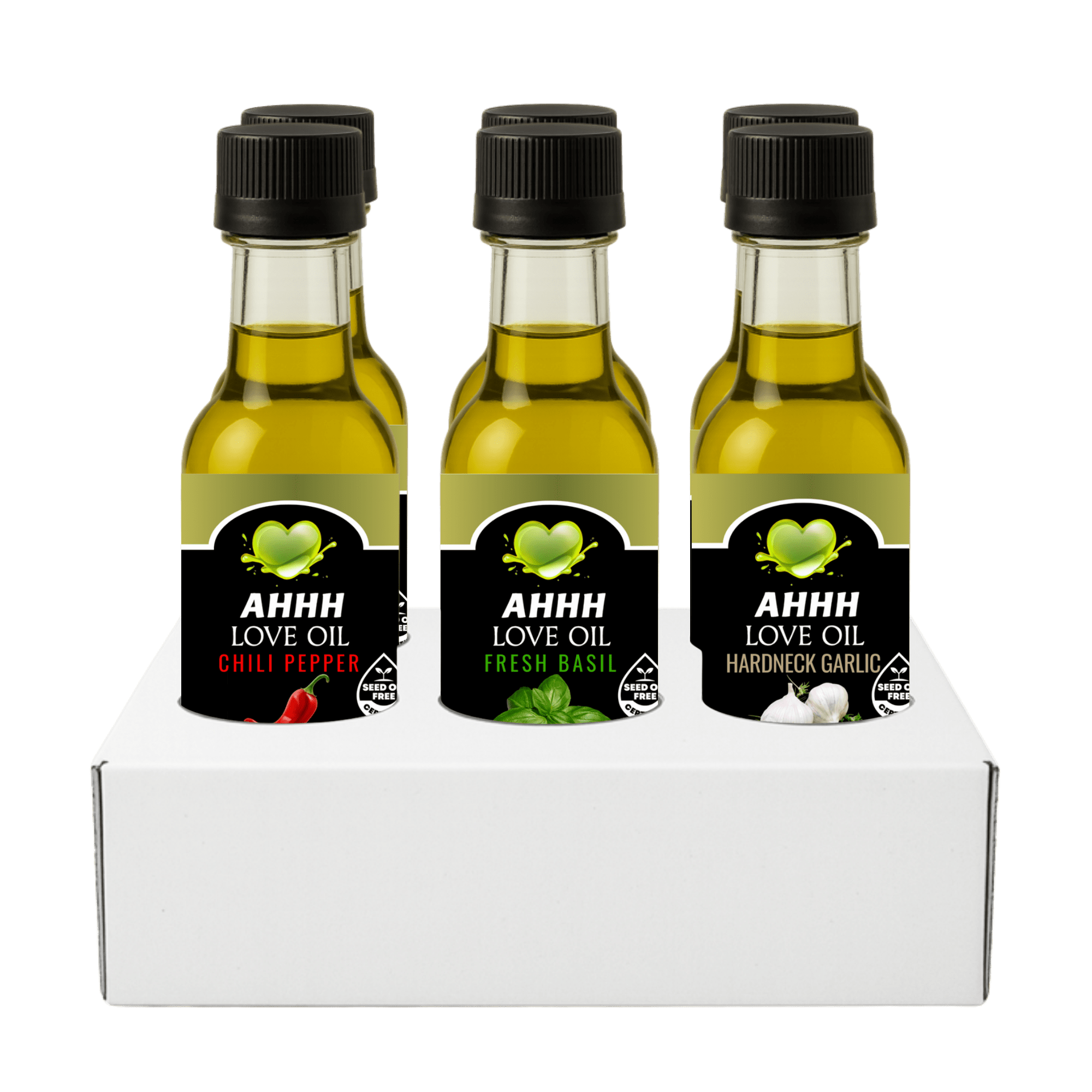 The AHHH Love Oil 1.5oz 6-Pack includes all six signature plant-based high-heat cooking oil flavors: Chili Pepper, Fresh Basil, Hardneck Garlic, Italian Herb, Lemon Zest, and Truffle Up. Perfect for gifting, travel, sampling, or adding bold flavor to any meal. Clean, healthy, and crafted for high-heat performance.