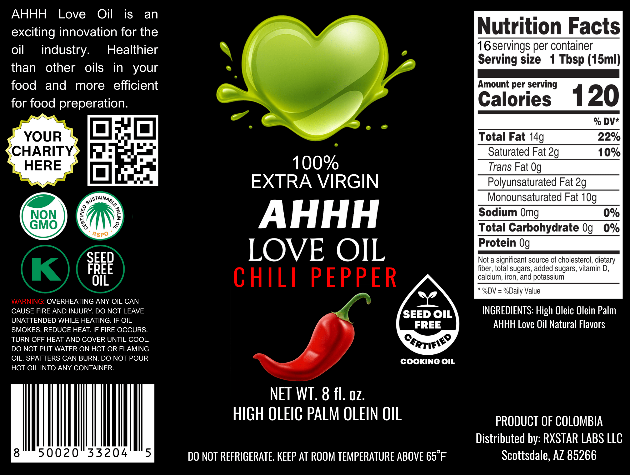 Turn up the heat with AHHH Love Oil Chili Pepper (8oz) — a gourmet High Oleic Cooking Oil infused with the vibrant kick of real chili peppers. This premium high-heat oil is designed for flavor lovers who crave spice without sacrificing health or cooking performance. Crafted from a naturally seedless tropical fruit grown on regenerative farms in Colombia, it’s rich in oleic acid and Vitamin E, offering heart-healthy benefits while maintaining exceptional stability at high temperatures.